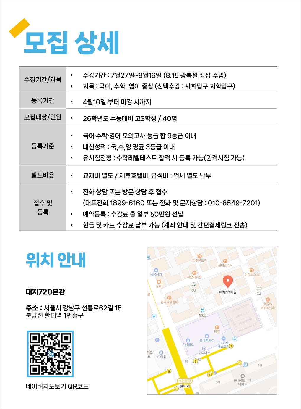 대치720 부트캠프(이하 ‘회사’라 한다)는 개인정보 보호법 제30조에 따라 정보 주체의 개인정보를 보호하고 이와 관련한 고충을 신속하고 원활하게 처리할 수 있도록 하기 위하여 다음과 같이 개인정보 처리지침을 수립, 공개합니다.