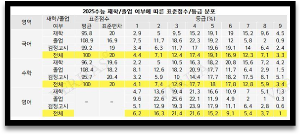 2025수능에서도 N수생의 상위권 독식 현상이 뚜렷하게 나타났다. 특히 표점 격차가 전년보다 더 벌어지며 올해 역시 재학생의 수능 등급 확보에 비상이 걸렸다는 분석이 나온다.
