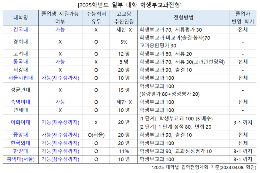 주요 대학들의 학생부교과전형은 지역균형전형으로, 학교장 추천이 필요하기 때문에 졸업생들에게는 부담일 수도 있는 상황이다. 올해에는 이화여대가 추천 가능 인원을 늘리면서 졸업생의 지원 장벽을 낮췄다. 이화여대는 그동안 고교 3학년 재적 여학생 수의 5%(최대 10명)까지 추천할 수 있도록 했으나 2025학년도에는 20명으로 추천 가능 인원을 크게 확대했다.