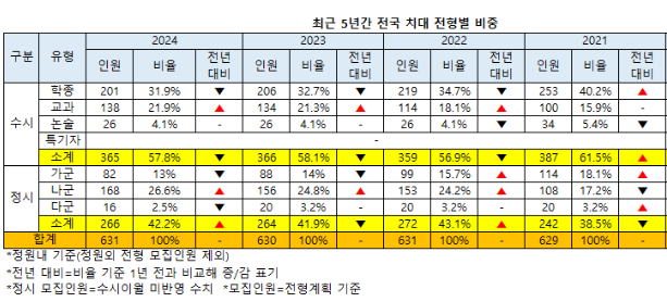 2024 전형계획에 의하면 치전원을 포함한 전국 11개 치대의 모집인원은 정원내 631명이다. 2023학년 전형계획상 인원과 비교해 1명 증가했다. 2024 수시/정시 비율은 각 57.8%(365명) 42.2%(266명)로, 2023학년 58.1%(366명) 41.9%(264명)와 비교해 정시 비중이 소폭 확대됐다.
