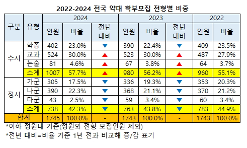 2024 약학과 수시 교과 30% ‘최대’ 학종 23%, 논술 4.6% 순