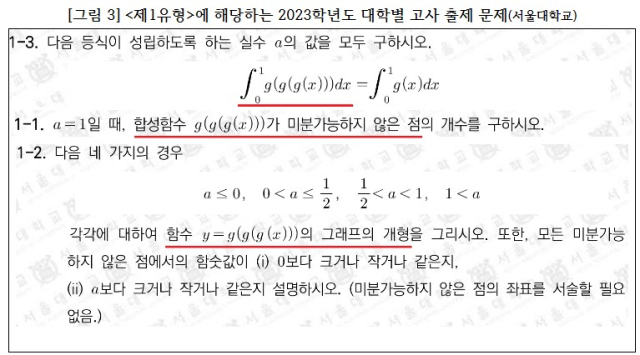 대학 과정이 포함된 문제도 26개(39.4%)나 됐다. 집합의 길이를 묻는 연세대 논술문제 또한 대학에서 다루는 '측도'에 대한 내용이 포함돼 있었고, 제시문 또한 대학에서 배우는 '적분과 측도이론', '정수론'과 일치하며 대학에서 배우는 ‘측도’와 관련된 개념을 활용해야 했다.