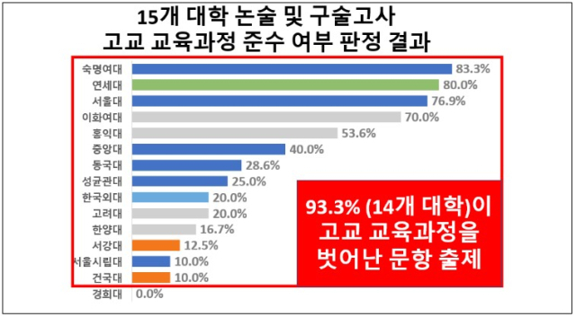 8일 교육시민단체 사교육걱정없는세상이 강민정 더불어민주당 의원과 함께 2023학년도 서울 소재 15개 대학의 자연계열 대학별고사(논·구술전형) 수학문제를 분석한 결과를 보면, 경희대를 제외한 14개 대학이 고교 교육과정의 범위와 수준을 벗어난 문제를 냈다.